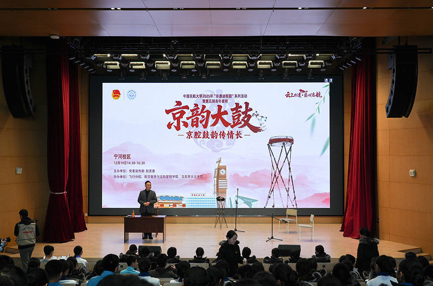 近日,中国民航大学“云上非遗 匠心启航”非遗进校园系列活动第六期“京腔鼓韵传情长——京韵大鼓”主题活动在该校宁河校区落幕。非物质文化遗产代表性传承人于会江现场讲授京韵大鼓非遗故事,并为师生表演《黛玉焚稿》《宝玉探晴雯》《孟姜女》等白派名段,悠扬鼓点与醇厚唱腔交织,让师生沉浸式感受中华优秀传统文化的博大精深。